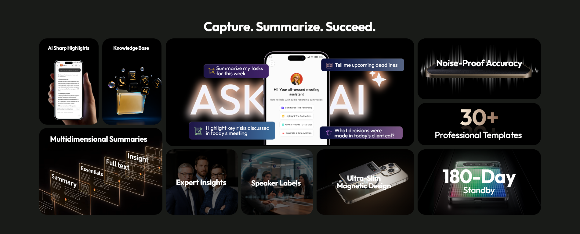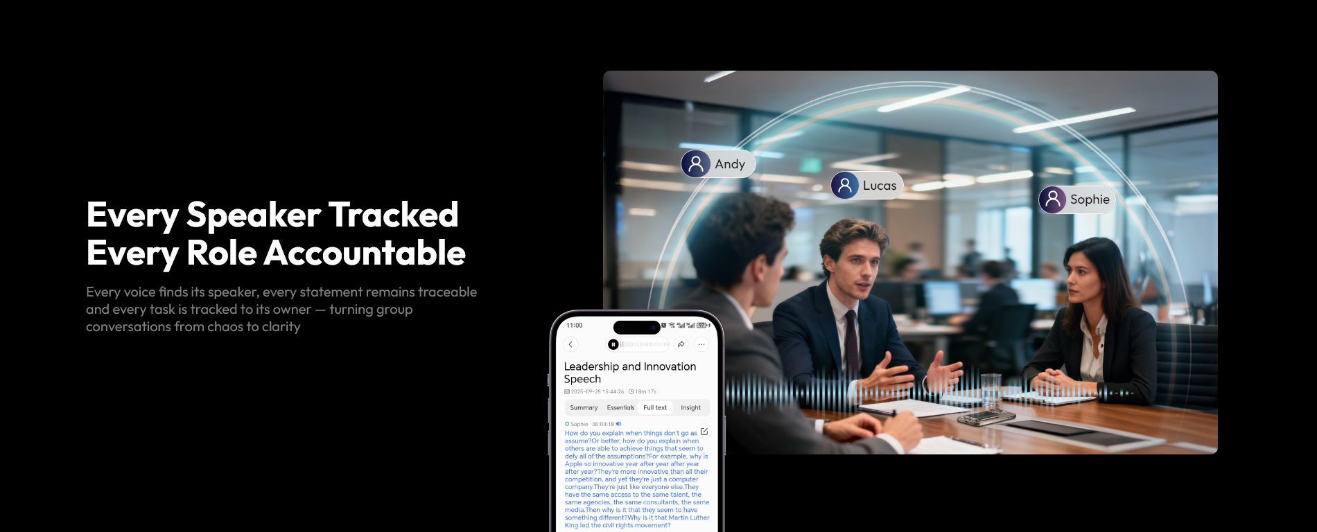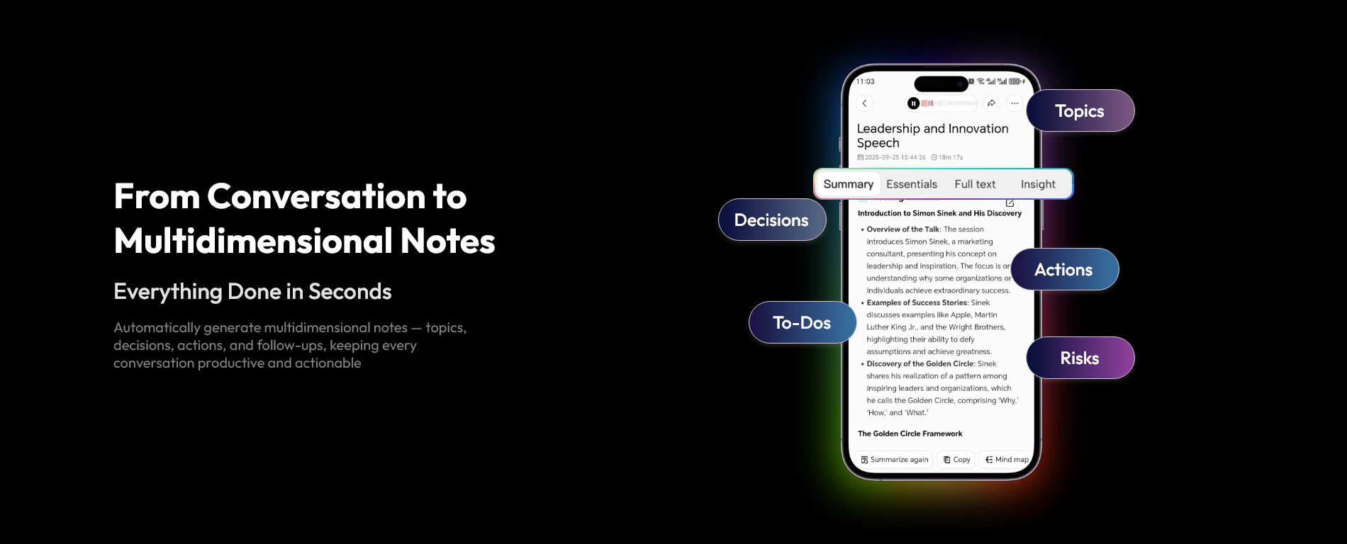 It is an AI-powered recording device that automatically generates structured meeting minutes (including topics, decisions, action items, and next steps) in real-time after a conversation, eliminating manual note-taking and post-meeting summarization.