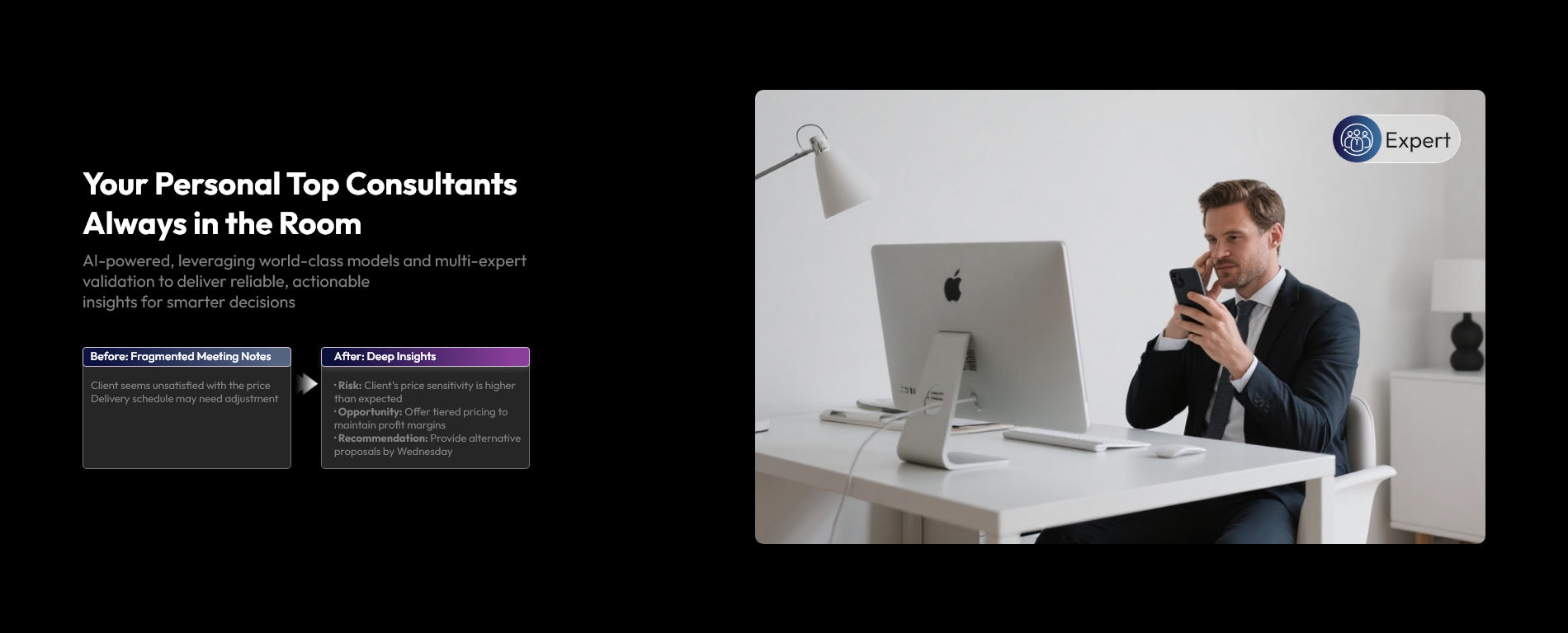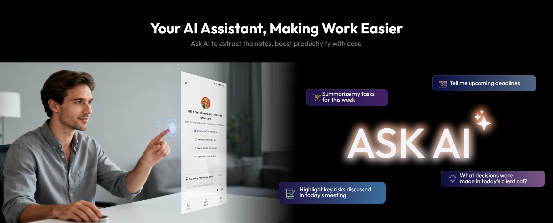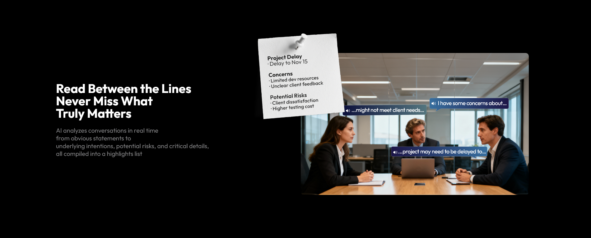 Going beyond transcription, it uses semantic analysis to uncover underlying risks, extract true user intent, and provide expert suggestions and follow-up questions. For example, it can flag potential project delays or identify a client's unspoken concerns about cost.